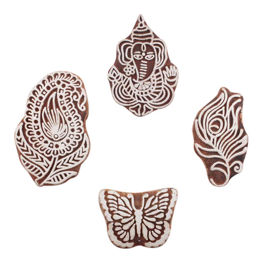 Set of 4 Piece New Mix Wooden Printing Block. Ideal for use on Fabric, Paper, Canvas, etc. These Blocks can be use to Print with Oil Colors, Fabric Colors, Water Colors, Acrylic Colors and Vegetable Colors.