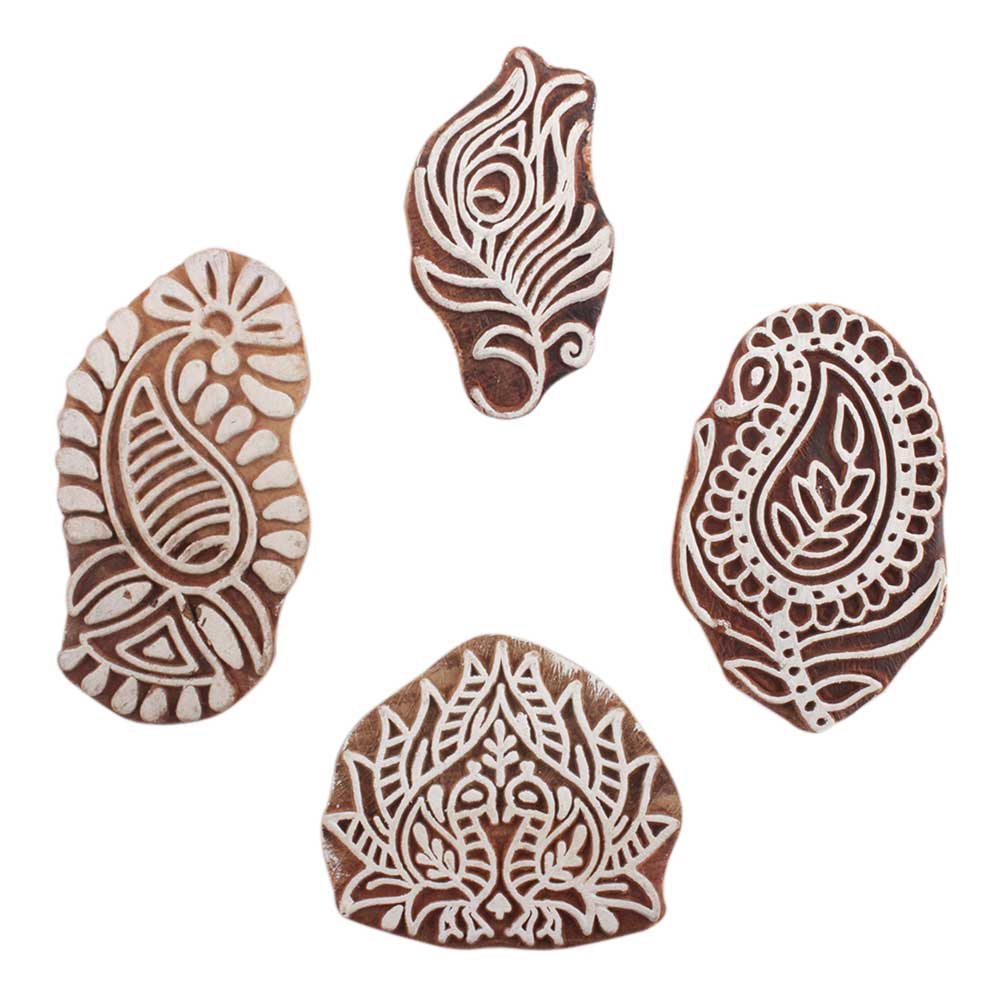 Set of 4 Piece New Mix Wooden Printing Block. Ideal for use on Fabric, Paper, Canvas, etc. These Blocks can be use to Print with Oil Colors, Fabric Colors, Water Colors, Acrylic Colors and Vegetable Colors.