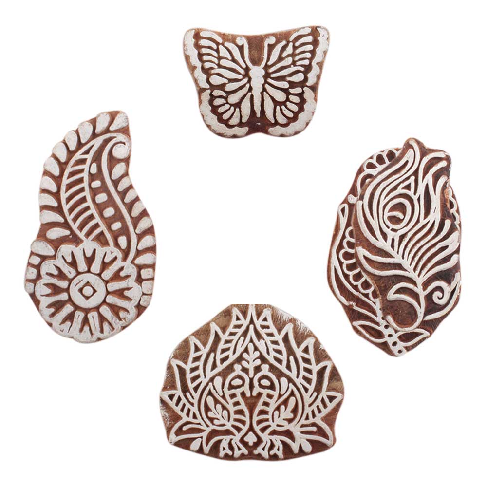 Set of 4 Piece New Mix Wooden Printing Block. Ideal for use on Fabric, Paper, Canvas, etc. These Blocks can be use to Print with Oil Colors, Fabric Colors, Water Colors, Acrylic Colors and Vegetable Colors.