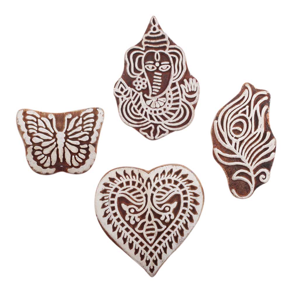 Set of 4 Piece New Mix Wooden Printing Block. Ideal for use on Fabric, Paper, Canvas, etc. These Blocks can be use to Print with Oil Colors, Fabric Colors, Water Colors, Acrylic Colors and Vegetable Colors.