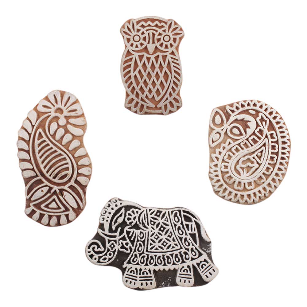 Set of 4 Piece New Mix Wooden Printing Block. Ideal for use on Fabric, Paper, Canvas, etc. These Blocks can be use to Print with Oil Colors, Fabric Colors, Water Colors, Acrylic Colors and Vegetable Colors.