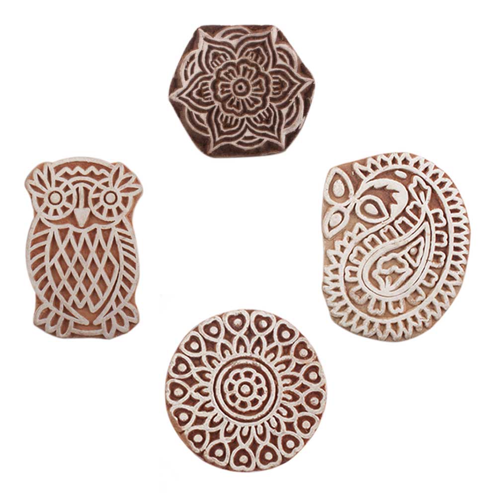 Set of 4 Piece New Mix Wooden Printing Block. Ideal for use on Fabric, Paper, Canvas, etc. These Blocks can be use to Print with Oil Colors, Fabric Colors, Water Colors, Acrylic Colors and Vegetable Colors.