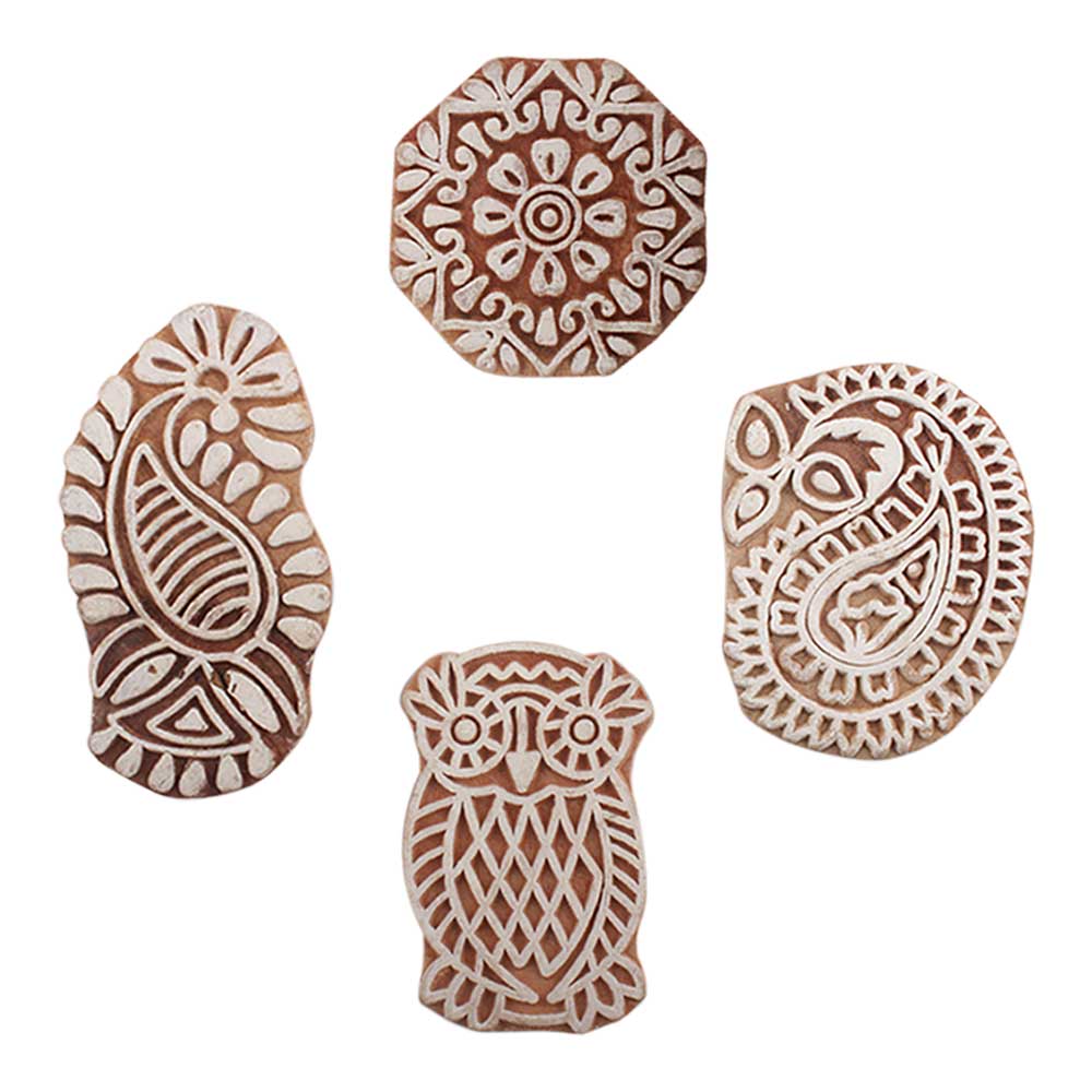 Set of 4 Piece New Mix Wooden Printing Blocks. Ideal for use on Fabric, Paper, Canvas, etc. These Blocks can be use to Print with Oil Colors, Fabric Colors, Water Colors, Acrylic Colors and Vegetable Colors.