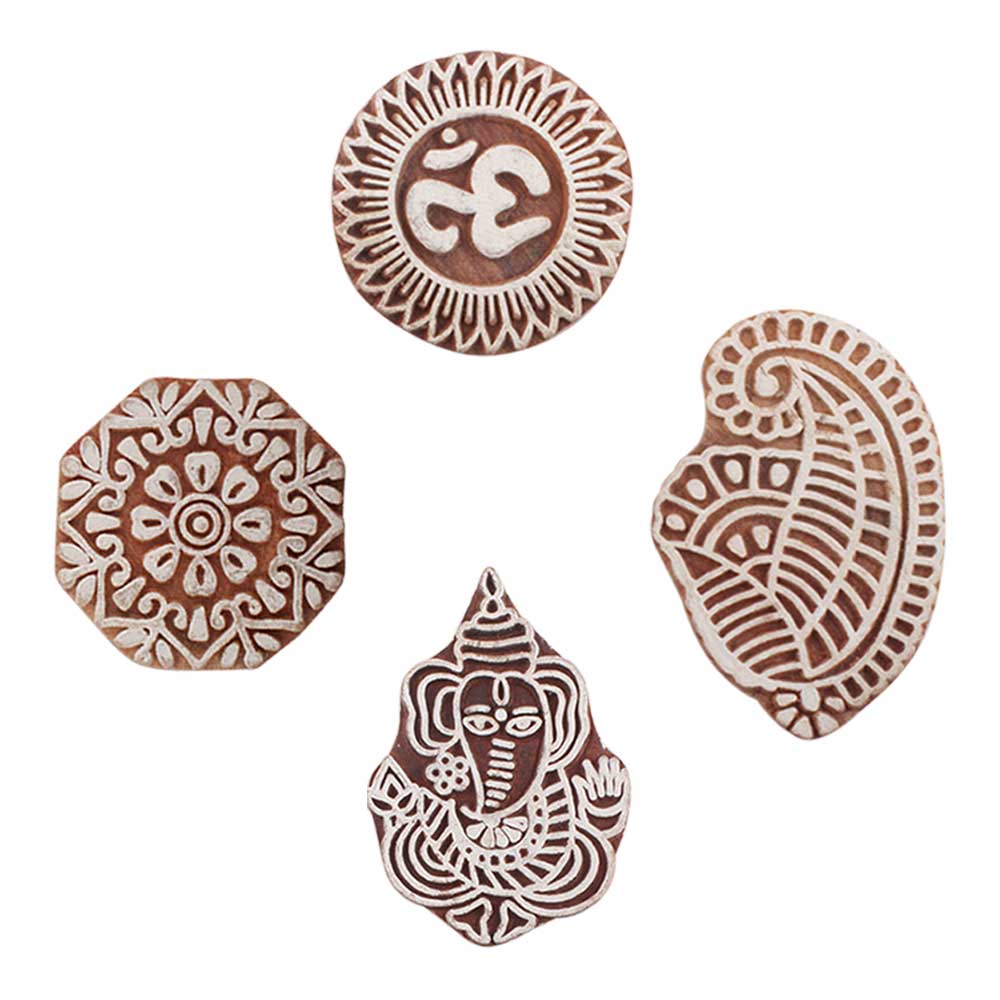 Set of 4 Piece New Mix Wooden Printing Blocks. Ideal for use on Fabric, Paper, Canvas, etc. These Blocks can be use to Print with Oil Colors, Fabric Colors, Water Colors, Acrylic Colors and Vegetable Colors.