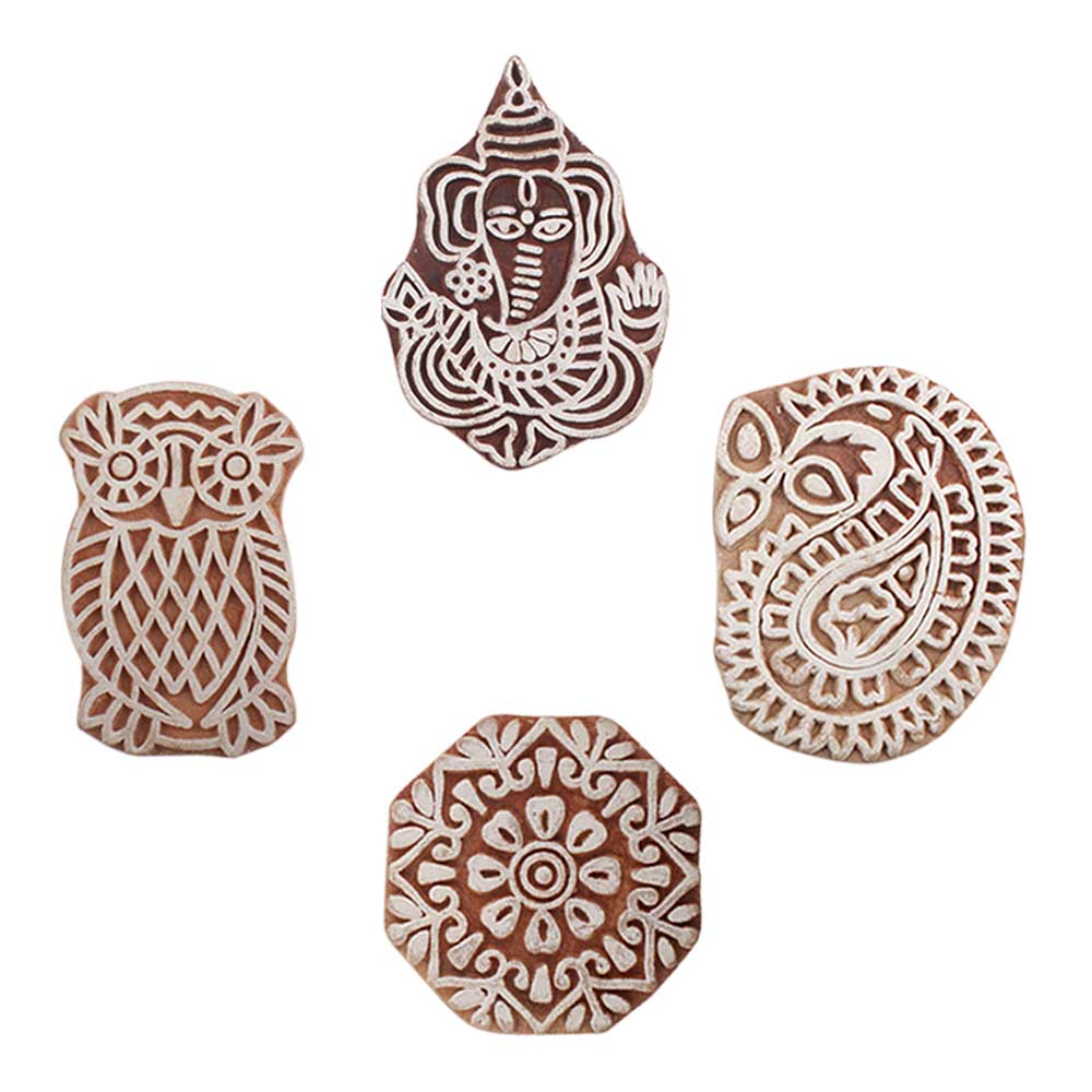 Set of 4 Piece New Mix Wooden Printing Blocks. Ideal for use on Fabric, Paper, Canvas, etc. These Blocks can be use to Print with Oil Colors, Fabric Colors, Water Colors, Acrylic Colors and Vegetable Colors.