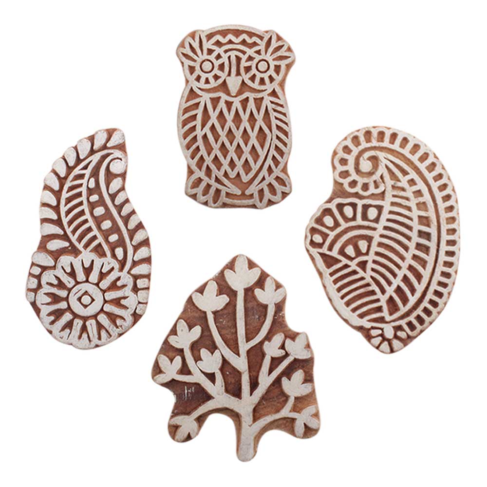 Set of 4 Piece New Mix Wooden Printing Blocks. Ideal for use on Fabric, Paper, Canvas, etc. These Blocks can be use to Print with Oil Colors, Fabric Colors, Water Colors, Acrylic Colors and Vegetable Colors.