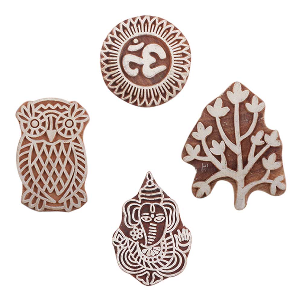 Set of 4 Piece New Mix Wooden Printing Blocks. Ideal for use on Fabric, Paper, Canvas, etc. These Blocks can be use to Print with Oil Colors, Fabric Colors, Water Colors, Acrylic Colors and Vegetable Colors.