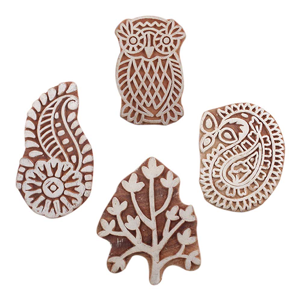 Set of 4 Piece New Mix Wooden Printing Blocks. Ideal for use on Fabric, Paper, Canvas, etc. These Blocks can be use to Print with Oil Colors, Fabric Colors, Water Colors, Acrylic Colors and Vegetable Colors.