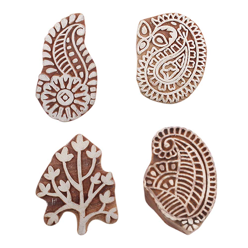 Set of 4 Piece New Mix Wooden Printing Blocks. Ideal for use on Fabric, Paper, Canvas, etc. These Blocks can be use to Print with Oil Colors, Fabric Colors, Water Colors, Acrylic Colors and Vegetable Colors.