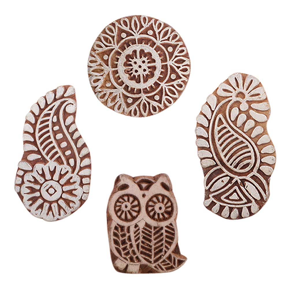 Set of 4 Piece New Mix Wooden Printing Blocks. Ideal for use on Fabric, Paper, Canvas, etc. These Blocks can be use to Print with Oil Colors, Fabric Colors, Water Colors, Acrylic Colors and Vegetable Colors.