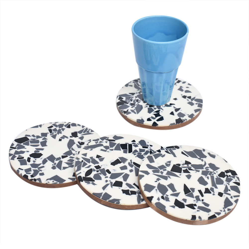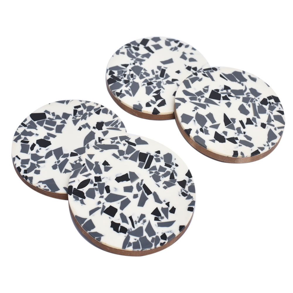 Terrazzo Pattern in Two Tone t his four-piece coaster set is an ideal housewarming, birthday, or wedding gift, and it's also great for decorating your kitchen, living room, bedroom, bar decorations, or office, among other places. Personalized absorbent resin and wood coasters help capture moisture from ice cold drinks and protect tabletops; they can also be given as Housewarming, Thanksgiving, Christmas, New Year, and Birthday gifts for friends, men, women, fathers, mothers, and grandmothers.