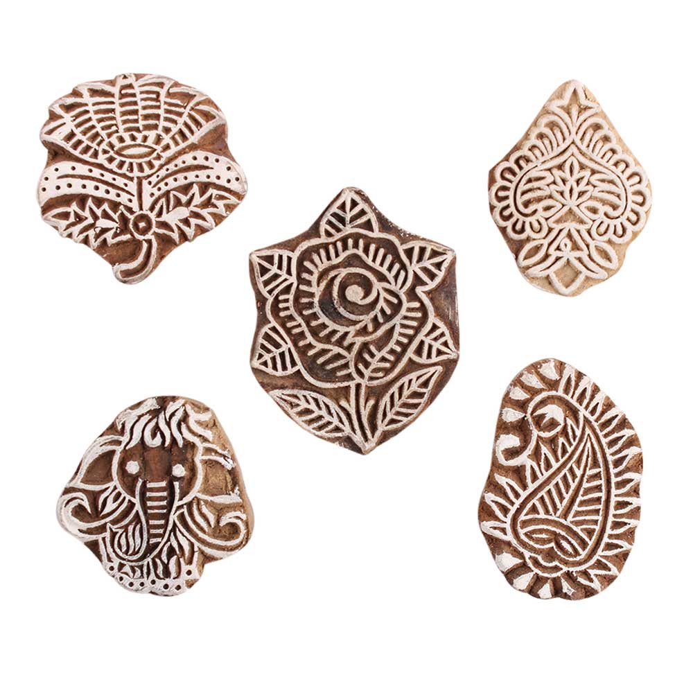 Set of 5 Piece New Mix Wooden Printing Block. Ideal for Using on Fabric, Paper, Canvas, etc. These Blocks can be use to Print with Oil Colors, Fabric Colors, Water Colors, Acrylic Colors and Vegetable Colors.