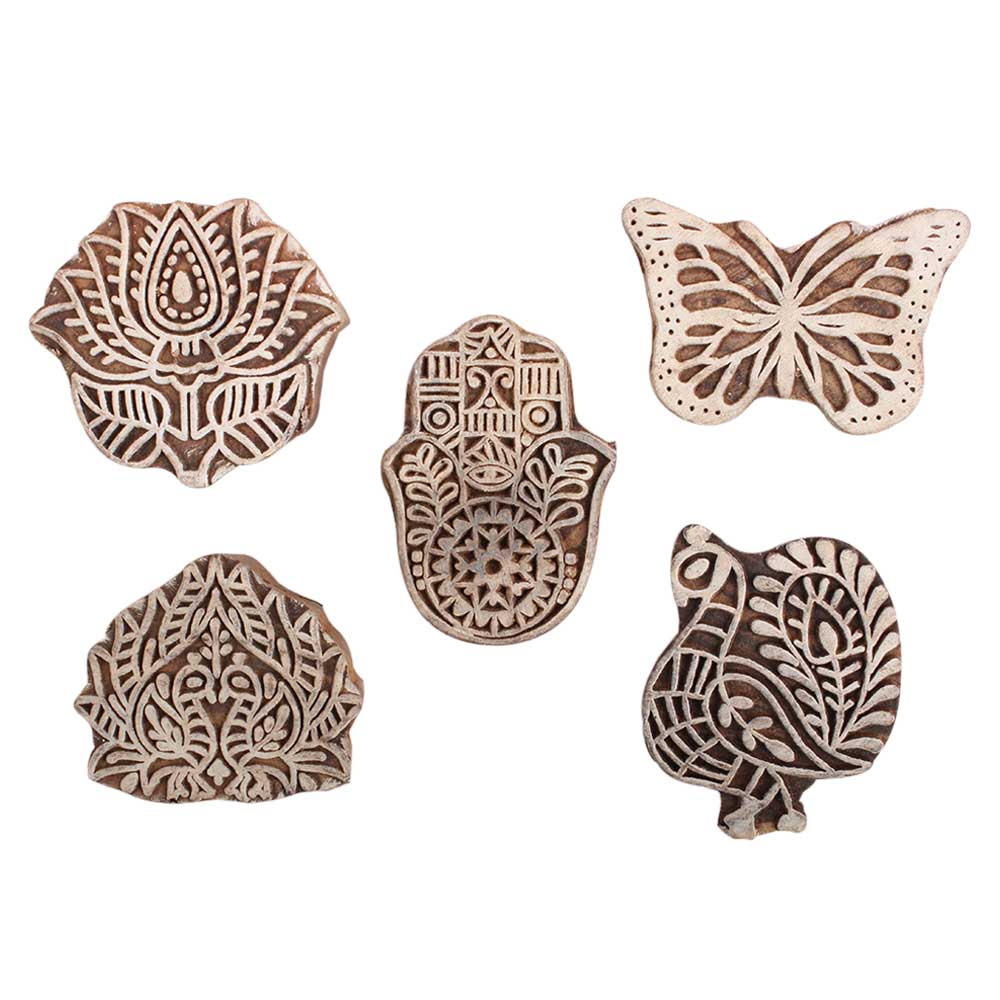 Set of 5 Piece New Mix Wooden Printing Block. Ideal for Using on Fabric, Paper, Canvas, etc. These Blocks can be use to Print with Oil Colors, Fabric Colors, Water Colors, Acrylic Colors and Vegetable Colors.
