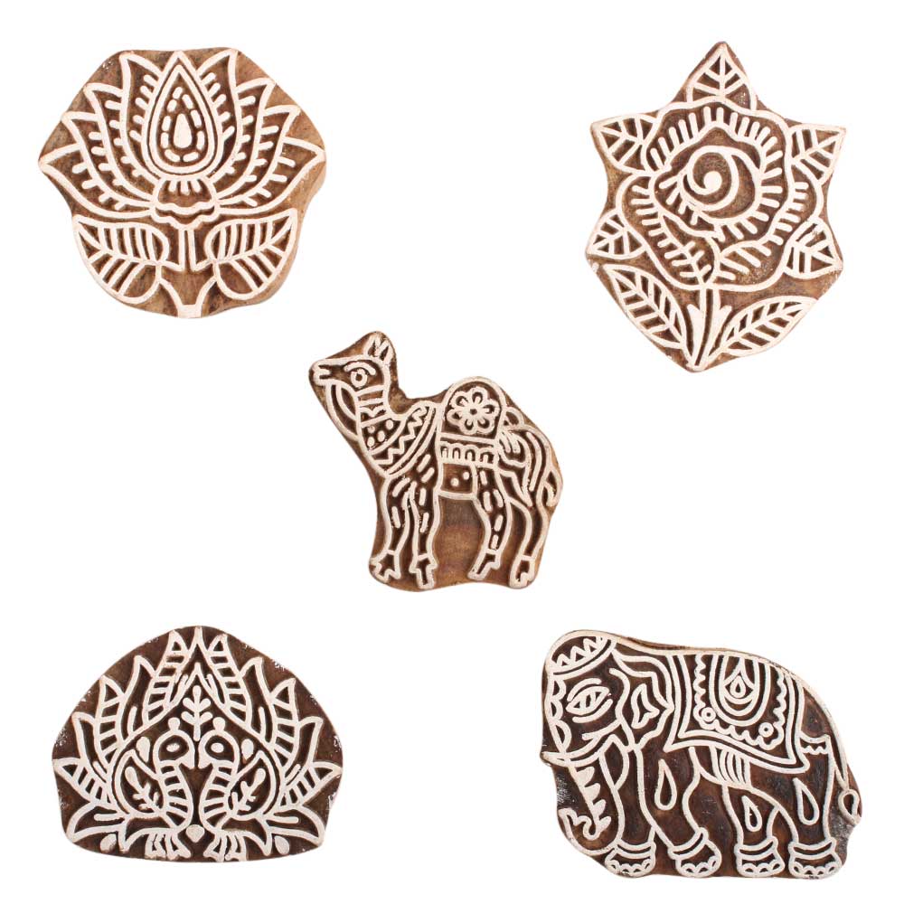 Set of 5 Piece New Mix Wooden Printing Block. Ideal for Using on Fabric, Paper, Canvas, etc. These Blocks can be use to Print with Oil Colors, Fabric Colors, Water Colors, Acrylic Colors and Vegetable Colors.