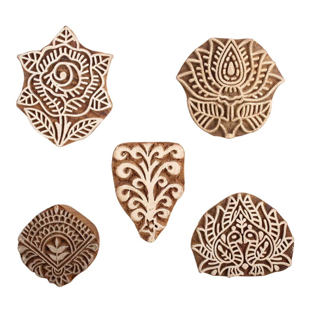 Set of 5 Piece New Mix Wooden Printing Block. Ideal for use on Fabric, Paper, Canvas, etc. These Blocks can be use to Print with Oil Colors, Fabric Colors, Water Colors, Acrylic Colors and Vegetable Colors.