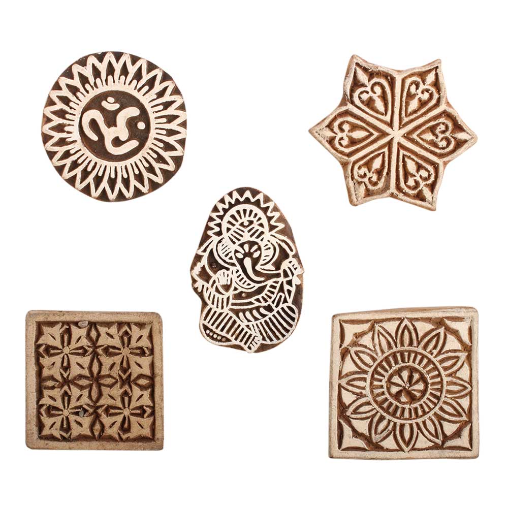Set of 5 Piece New Mix Wooden Printing Block. Ideal for use on Fabric, Paper, Canvas, etc. These Blocks can be use to Print with Oil Colors, Fabric Colors, Water Colors, Acrylic Colors and Vegetable Colors.