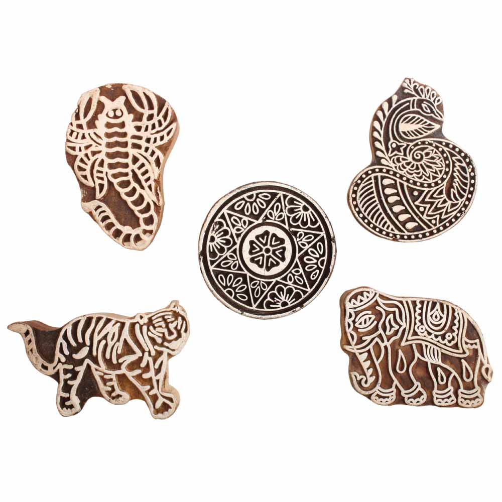 Set of 5 Piece New Mix Wooden Printing Block. Ideal for use on Fabric, Paper, Canvas, etc. These Blocks can be use to Print with Oil Colors, Fabric Colors, Water Colors, Acrylic Colors and Vegetable Colors.