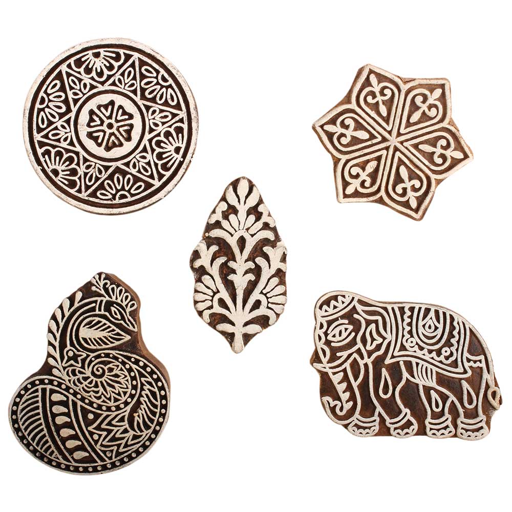Set of 5 Piece New Mix Wooden Printing Block. Ideal for use on Fabric, Paper, Canvas, etc. These Blocks can be use to Print with Oil Colors, Fabric Colors, Water Colors, Acrylic Colors and Vegetable Colors.