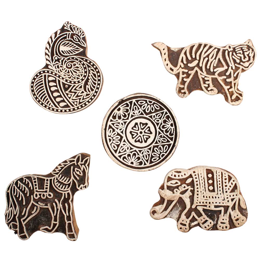 Set of 5 Piece New Mix Wooden Printing Block. Ideal for use on Fabric, Paper, Canvas, etc. These Blocks can be use to Print with Oil Colors, Fabric Colors, Water Colors, Acrylic Colors and Vegetable Colors.