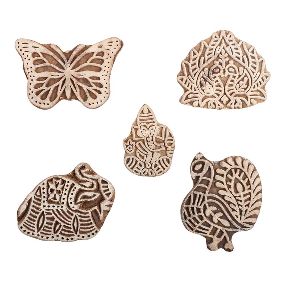 Set of 5 Piece New Mix Wooden Printing Block. Ideal for use on Fabric, Paper, Canvas, etc. These Blocks can be use to Print with Oil Colors, Fabric Colors, Water Colors, Acrylic Colors and Vegetable Colors.