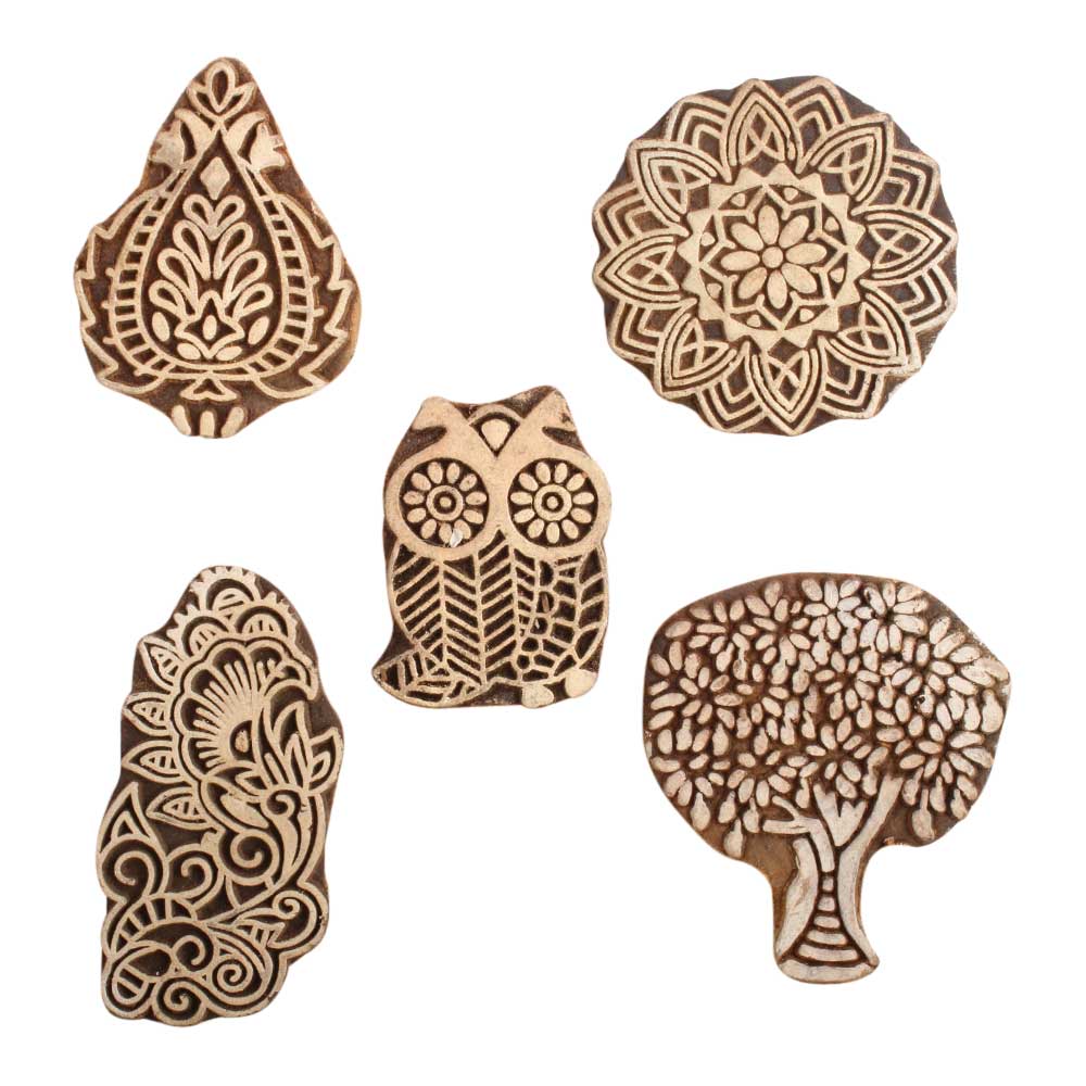 Set of 5 Piece New Mix Wooden Printing Block. Ideal for use on Fabric, Paper, Canvas, etc. These Blocks can be use to Print with Oil Colors, Fabric Colors, Water Colors, Acrylic Colors and Vegetable Colors.