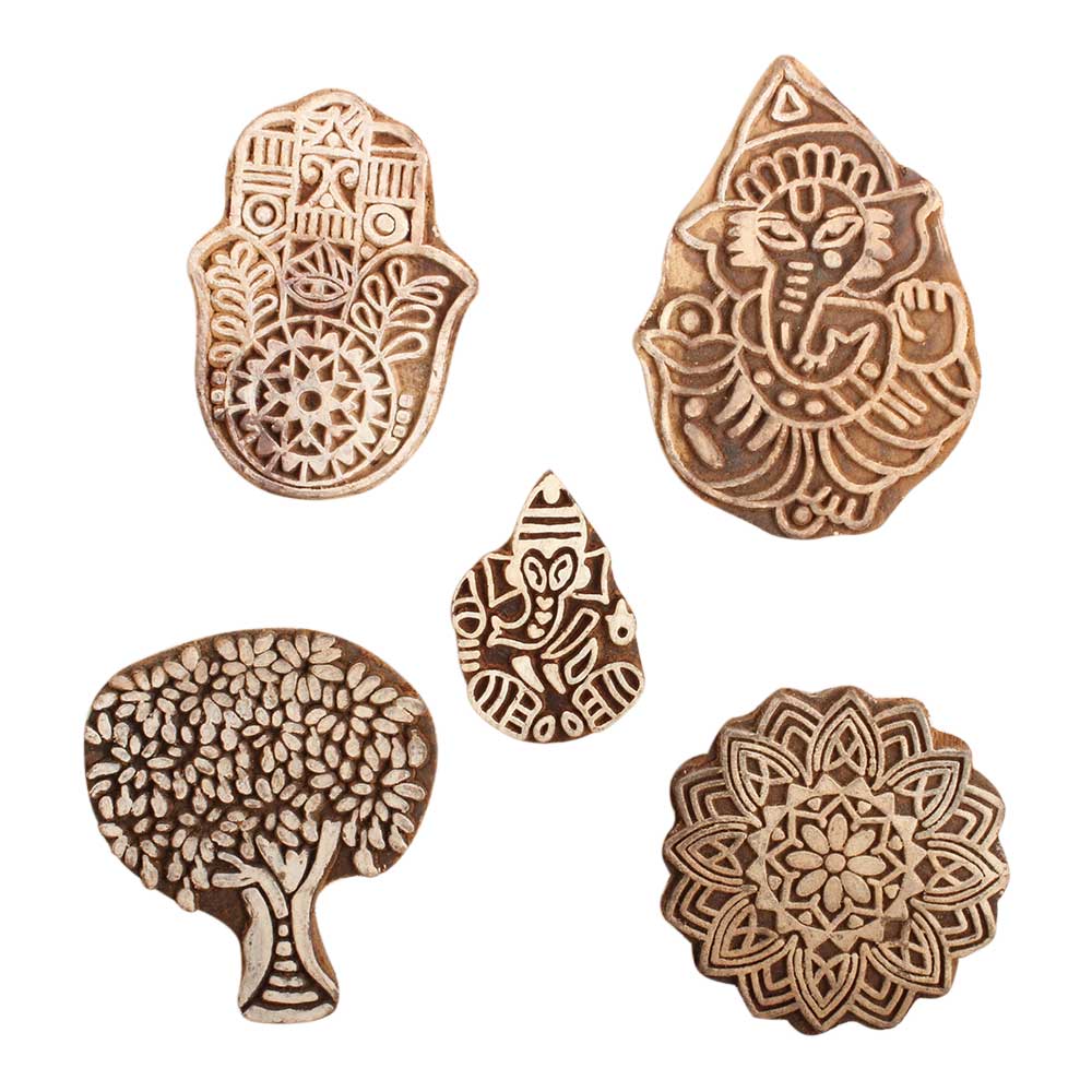 Set of 5 Piece New Mix Wooden Printing Block. Ideal for use on Fabric, Paper, Canvas, etc. These Blocks can be use to Print with Oil Colors, Fabric Colors, Water Colors, Acrylic Colors and Vegetable Colors.