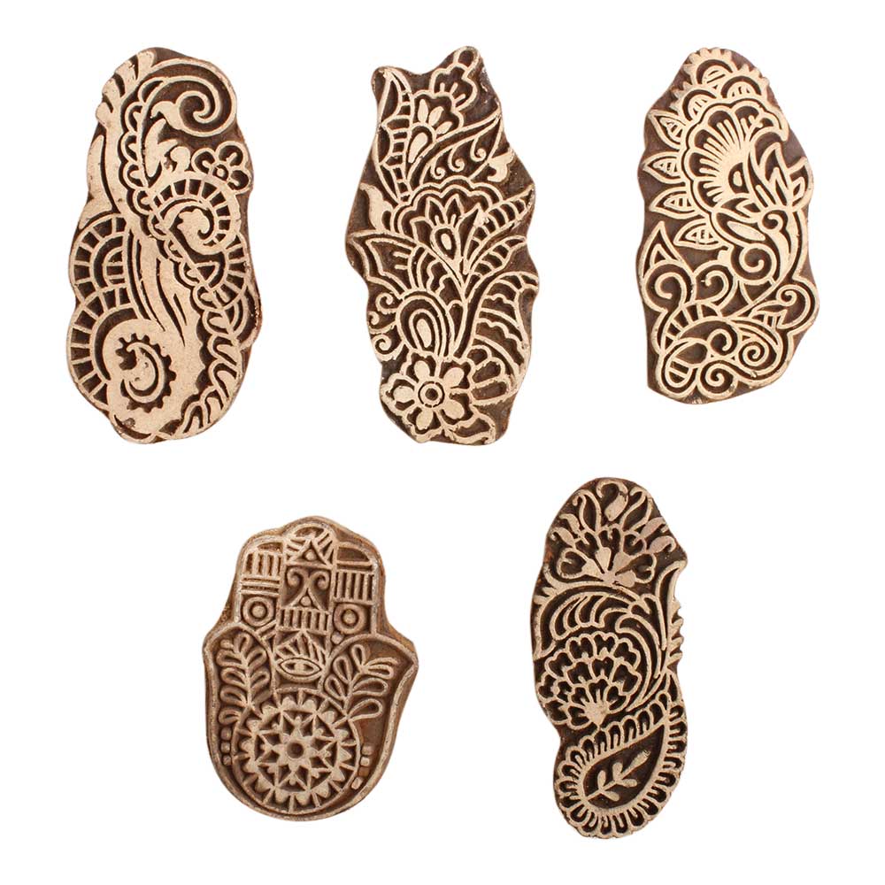 Set of 5 Piece New Mix Wooden Printing Block. Ideal for use on Fabric, Paper, Canvas, etc. These Blocks can be use to Print with Oil Colors, Fabric Colors, Water Colors, Acrylic Colors and Vegetable Colors.