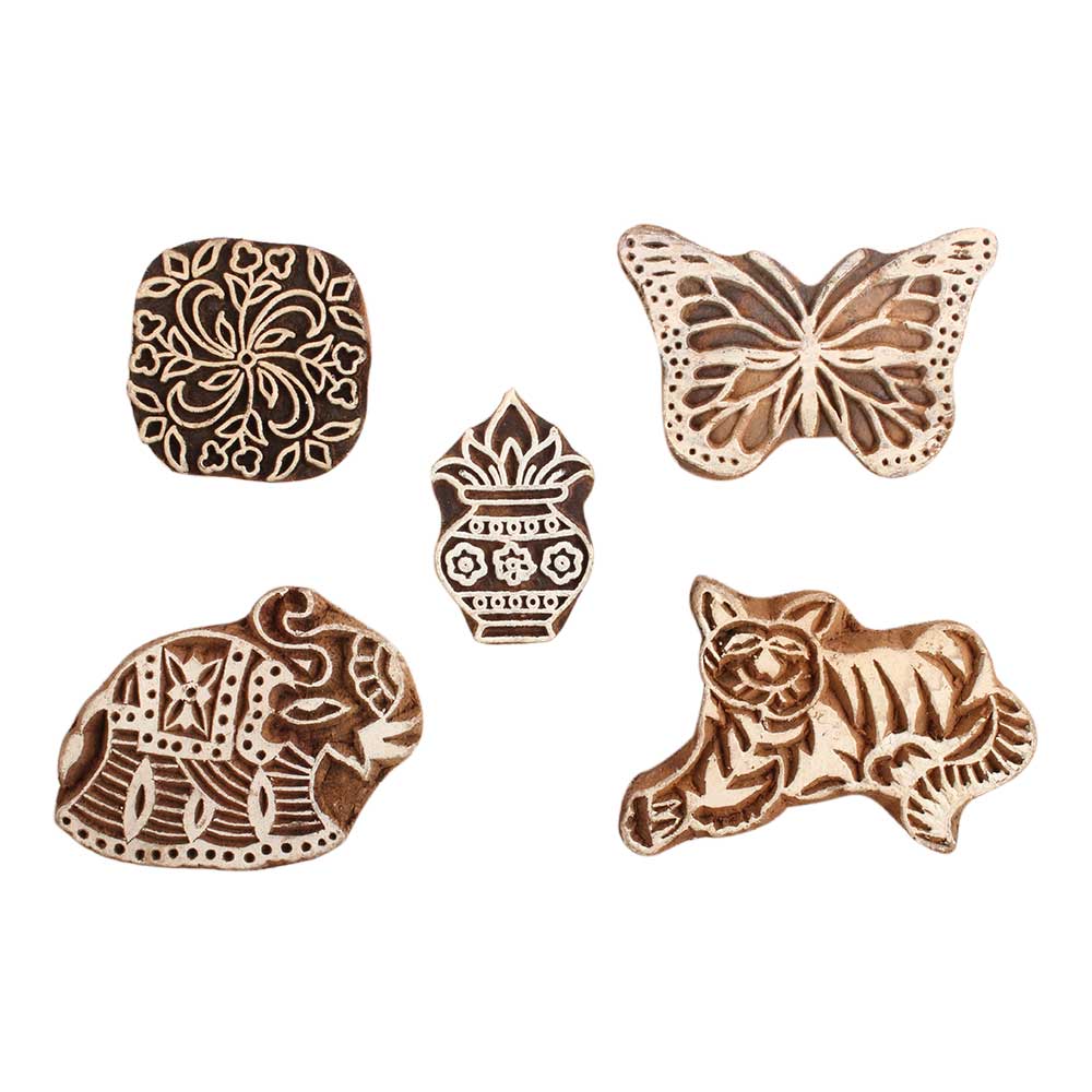 Set of 5 Piece New Mix Wooden Printing Block. Ideal for use on Fabric, Paper, Canvas, etc. These Blocks can be use to Print with Oil Colors, Fabric Colors, Water Colors, Acrylic Colors and Vegetable Colors.