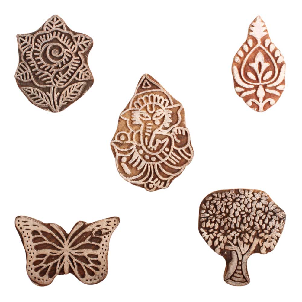 Set of 5 Piece New Mix Wooden Printing Block. Ideal for use on Fabric, Paper, Canvas, etc. These Blocks can be use to Print with Oil Colors, Fabric Colors, Water Colors, Acrylic Colors and Vegetable Colors.