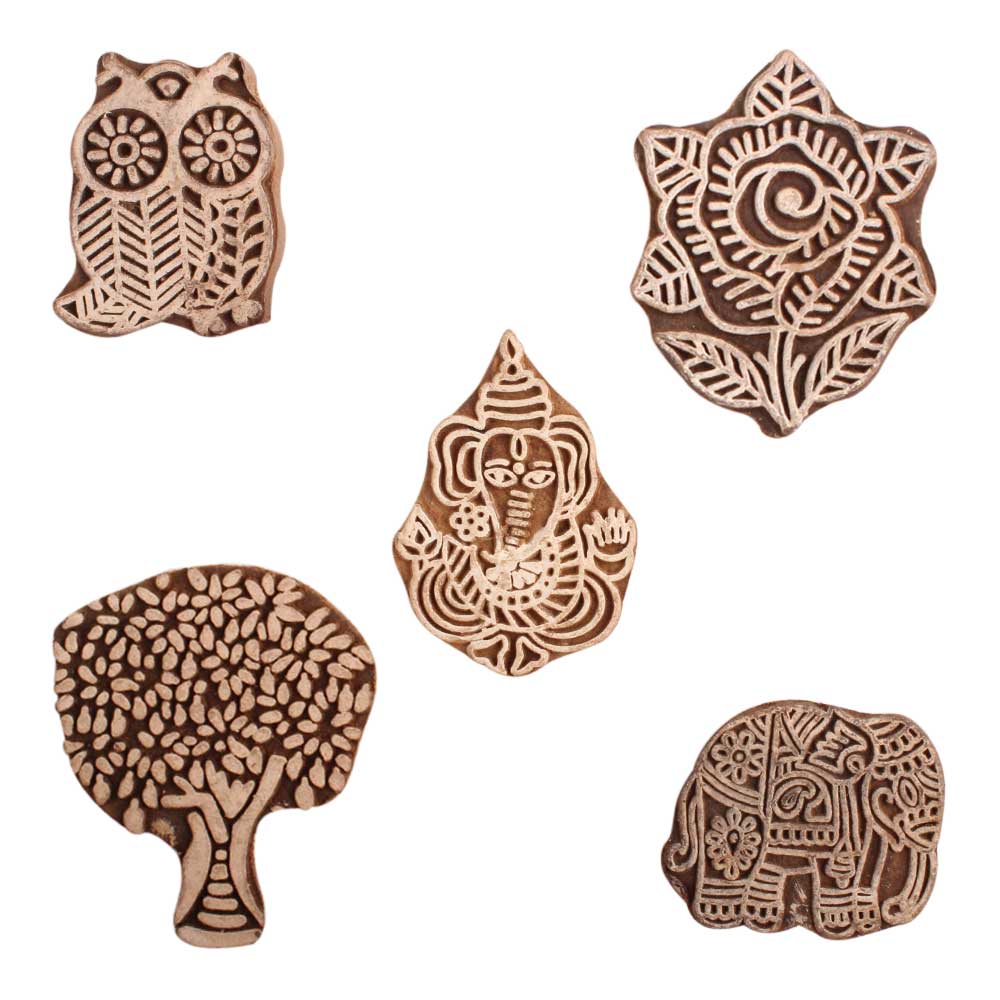 Set of 5 Piece New Mix Wooden Printing Block. Ideal for use on Fabric, Paper, Canvas, etc. These Blocks can be use to Print with Oil Colors, Fabric Colors, Water Colors, Acrylic Colors and Vegetable Colors.
