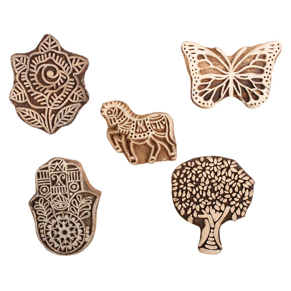 Set of 5 Piece New Mix Wooden Printing Block. Ideal for use on Fabric, Paper, Canvas, etc. These Blocks can be use to Print with Oil Colors, Fabric Colors, Water Colors, Acrylic Colors and Vegetable Colors.