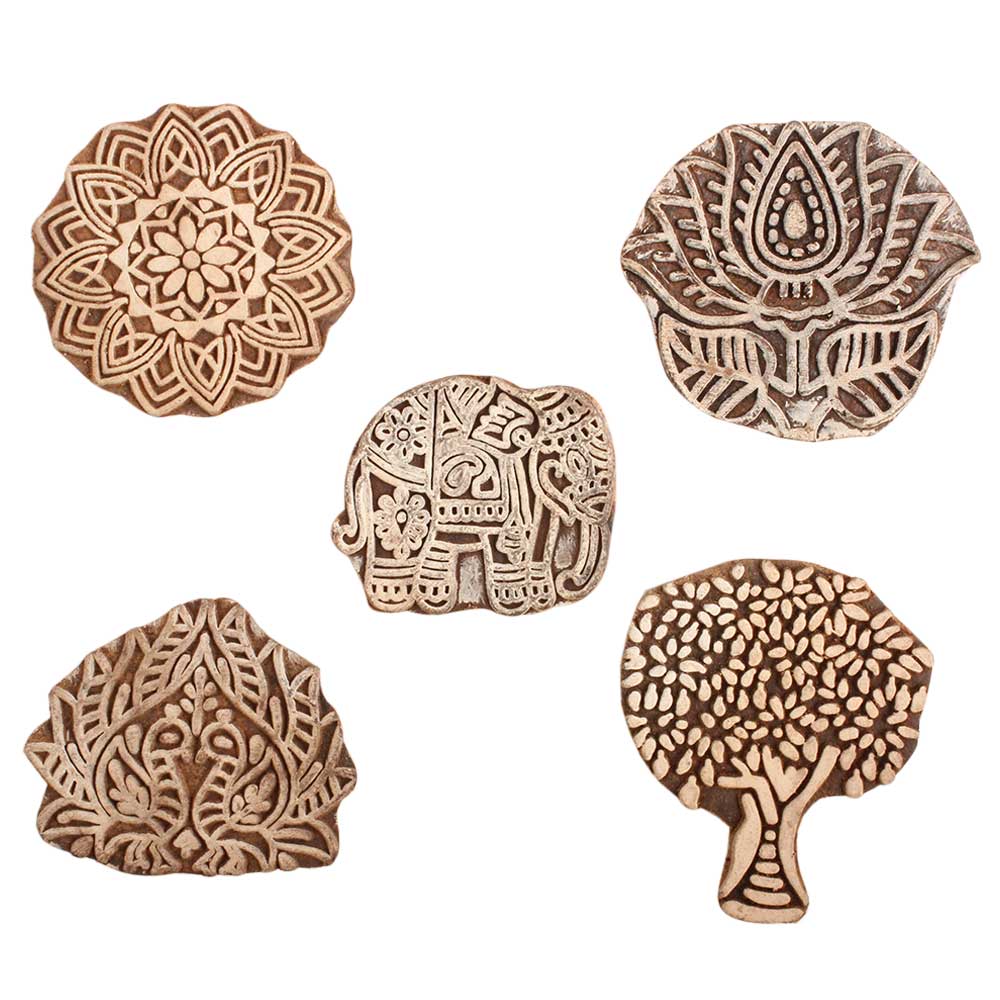 Set of 5 Piece New Mix Wooden Printing Block. Ideal for use on Fabric, Paper, Canvas, etc. These Blocks can be use to Print with Oil Colors, Fabric Colors, Water Colors, Acrylic Colors and Vegetable Colors.