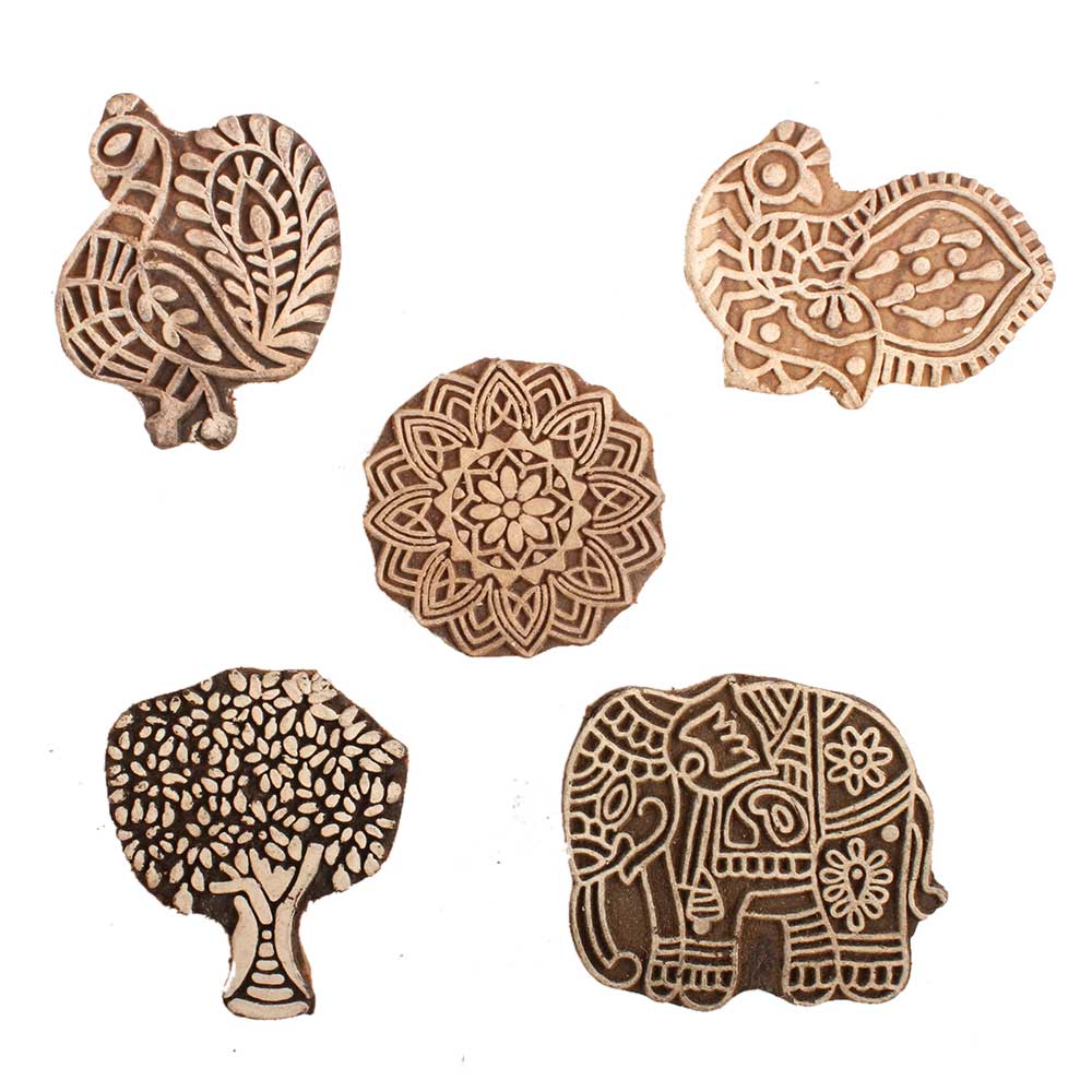 Set of 5 Piece New Mix Wooden Printing Block. Ideal for use on Fabric, Paper, Canvas, etc. These Blocks can be use to Print with Oil Colors, Fabric Colors, Water Colors, Acrylic Colors and Vegetable Colors.
