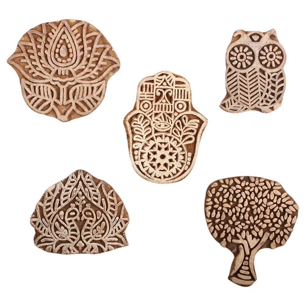 Set of 5 Piece New Mix Wooden Printing Block. Ideal for use on Fabric, Paper, Canvas, etc. These Blocks can be use to Print with Oil Colors, Fabric Colors, Water Colors, Acrylic Colors and Vegetable Colors.