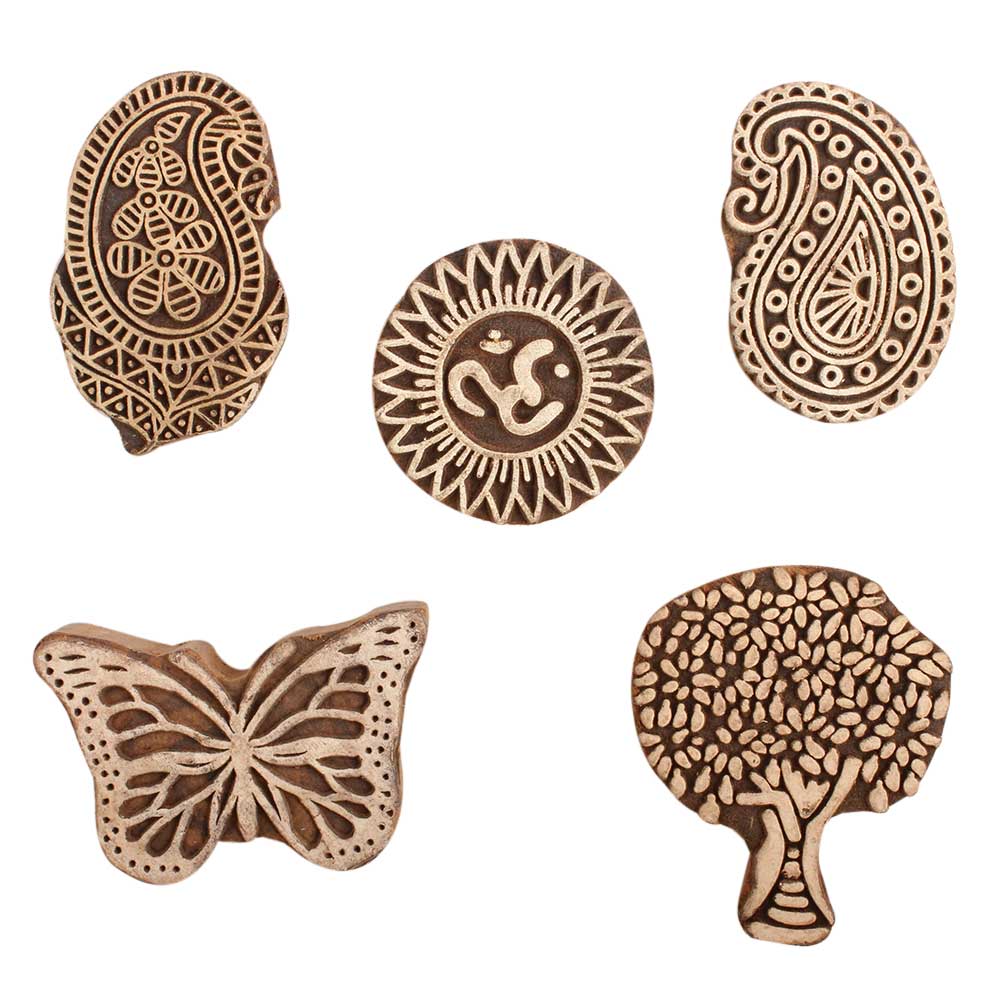 Set of 5 Piece New Mix Wooden Printing Block. Ideal for use on Fabric, Paper, Canvas, etc. These Blocks can be use to Print with Oil Colors, Fabric Colors, Water Colors, Acrylic Colors and Vegetable Colors.