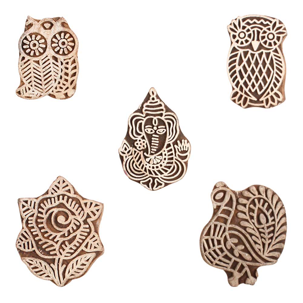Set of 5 Piece New Mix Wooden Printing Block. Ideal for use on Fabric, Paper, Canvas, etc. These Blocks can be use to Print with Oil Colors, Fabric Colors, Water Colors, Acrylic Colors and Vegetable Colors.