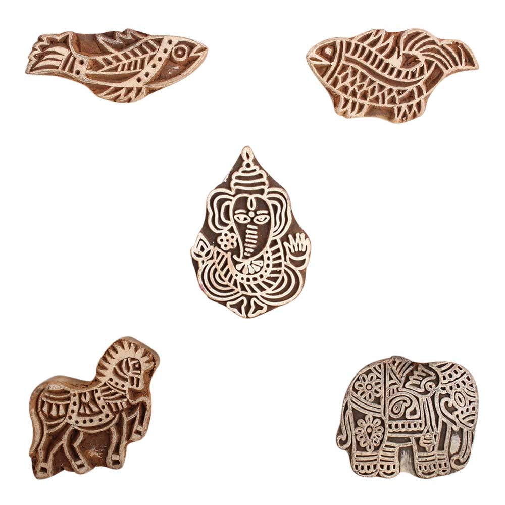 Set of 5 Piece New Mix Wooden Printing Block. Ideal for use on Fabric, Paper, Canvas, etc. These Blocks can be use to Print with Oil Colors, Fabric Colors, Water Colors, Acrylic Colors and Vegetable Colors.