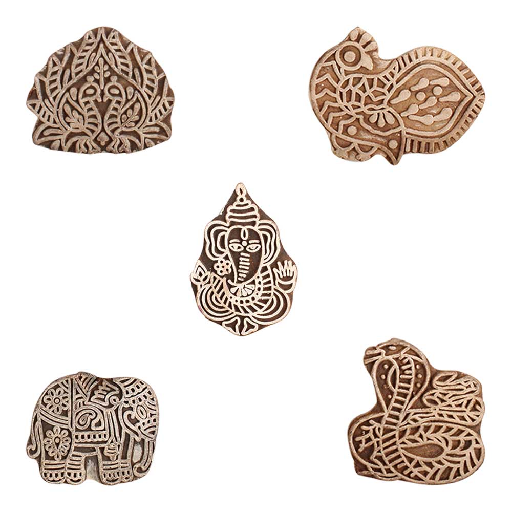 Set of 5 Piece New Mix Wooden Printing Block. Ideal for use on Fabric, Paper, Canvas, etc. These Blocks can be use to Print with Oil Colors, Fabric Colors, Water Colors, Acrylic Colors and Vegetable Colors.
