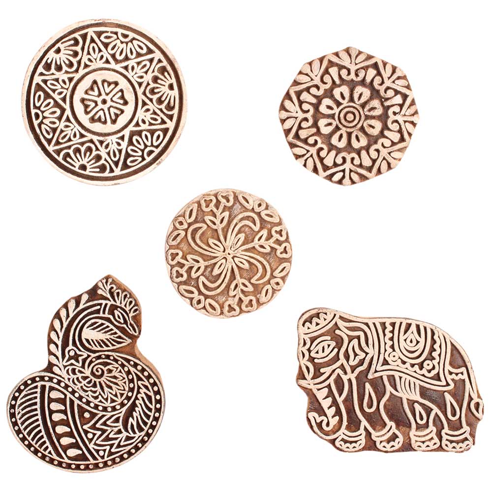Set of 5 Piece New Mix Wooden Printing Block. Ideal for use on Fabric, Paper, Canvas, etc. These Blocks can be use to Print with Oil Colors, Fabric Colors, Water Colors, Acrylic Colors and Vegetable Colors.