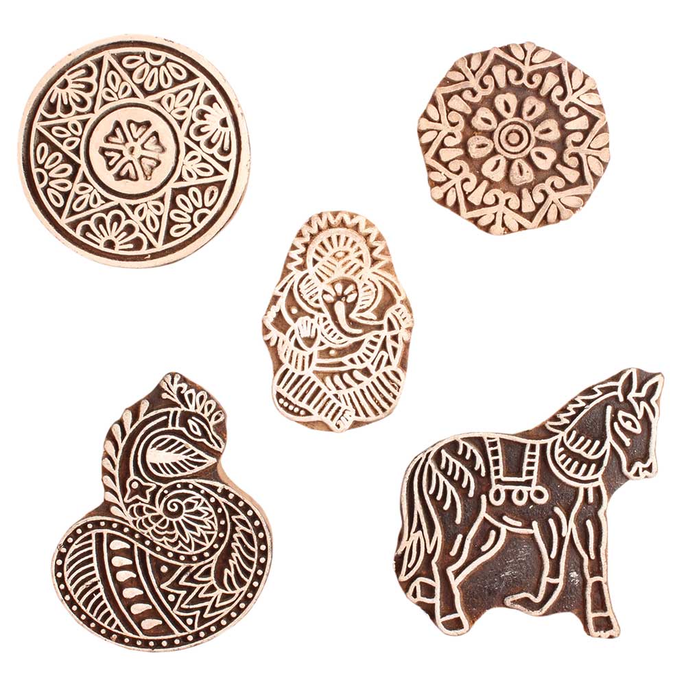 Set of 5 Piece New Mix Wooden Printing Block. Ideal for use on Fabric, Paper, Canvas, etc. These Blocks can be use to Print with Oil Colors, Fabric Colors, Water Colors, Acrylic Colors and Vegetable Colors.