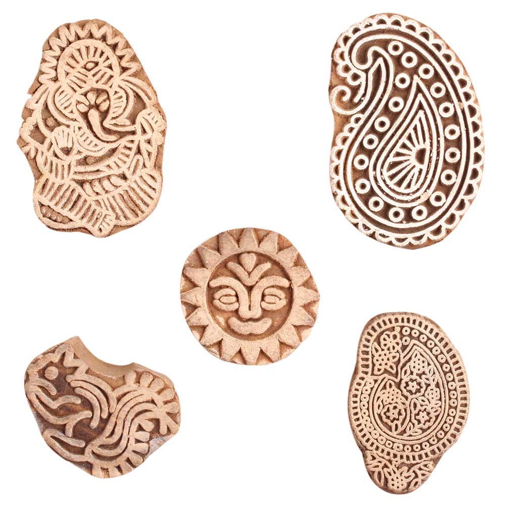 Set of 5 Piece New Mix Wooden Printing Block. Ideal for use on Fabric, Paper, Canvas, etc. These Blocks can be use to Print with Oil Colors, Fabric Colors, Water Colors, Acrylic Colors and Vegetable Colors.