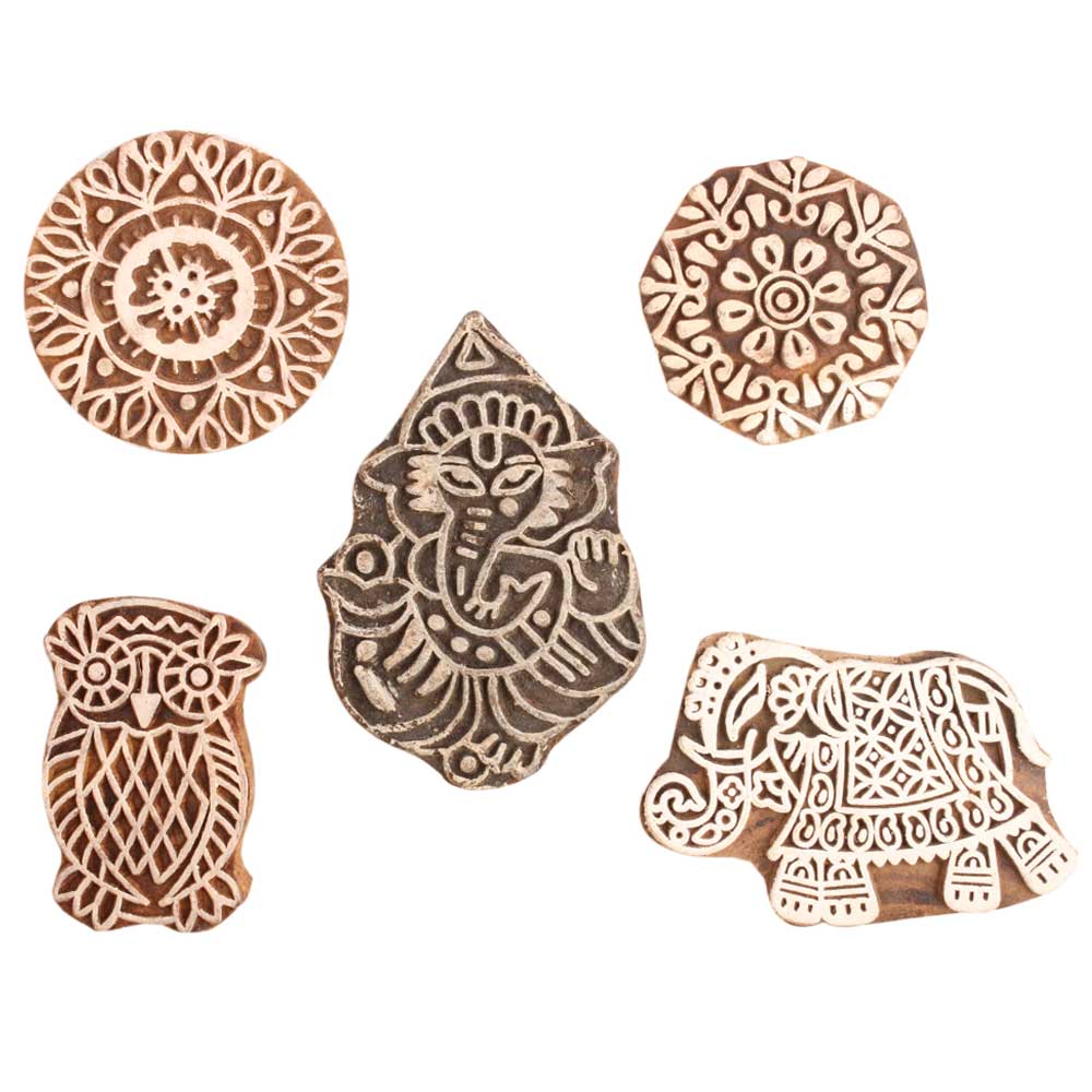 Set of 5 Piece New Mix Wooden Printing Block. Ideal for use on Fabric, Paper, Canvas, etc. These Blocks can be use to Print with Oil Colors, Fabric Colors, Water Colors, Acrylic Colors and Vegetable Colors.