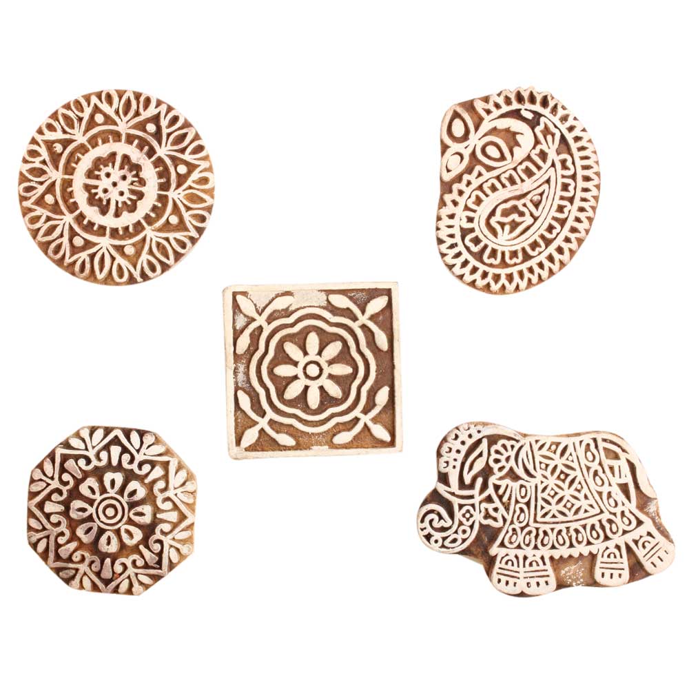Set of 5 Piece New Mix Wooden Printing Block. Ideal for use on Fabric, Paper, Canvas, etc. These Blocks can be use to Print with Oil Colors, Fabric Colors, Water Colors, Acrylic Colors and Vegetable Colors.