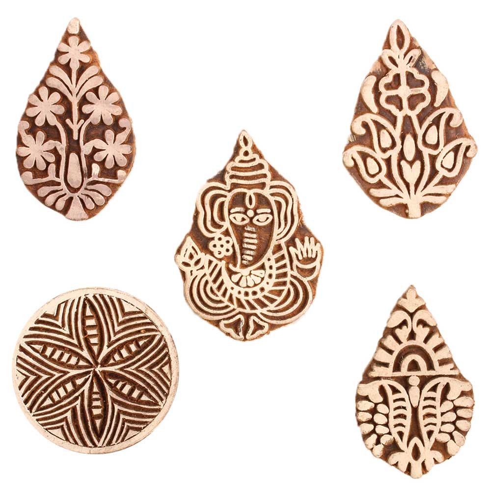 Set of 5 Piece New Mix Wooden Printing Block. Ideal for use on Fabric, Paper, Canvas, etc. These Blocks can be use to Print with Oil Colors, Fabric Colors, Water Colors, Acrylic Colors and Vegetable Colors.