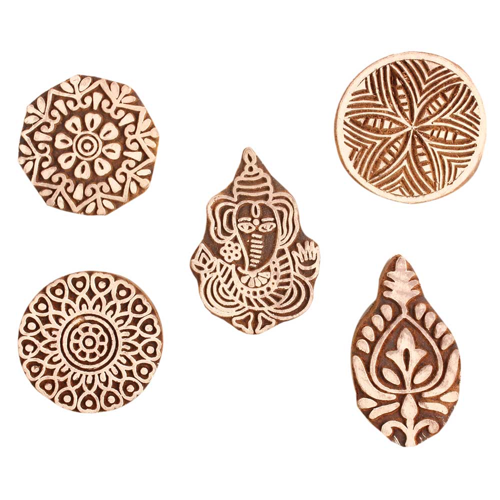 Set of 5 Piece New Mix Wooden Printing Block. Ideal for use on Fabric, Paper, Canvas, etc. These Blocks can be use to Print with Oil Colors, Fabric Colors, Water Colors, Acrylic Colors and Vegetable Colors.