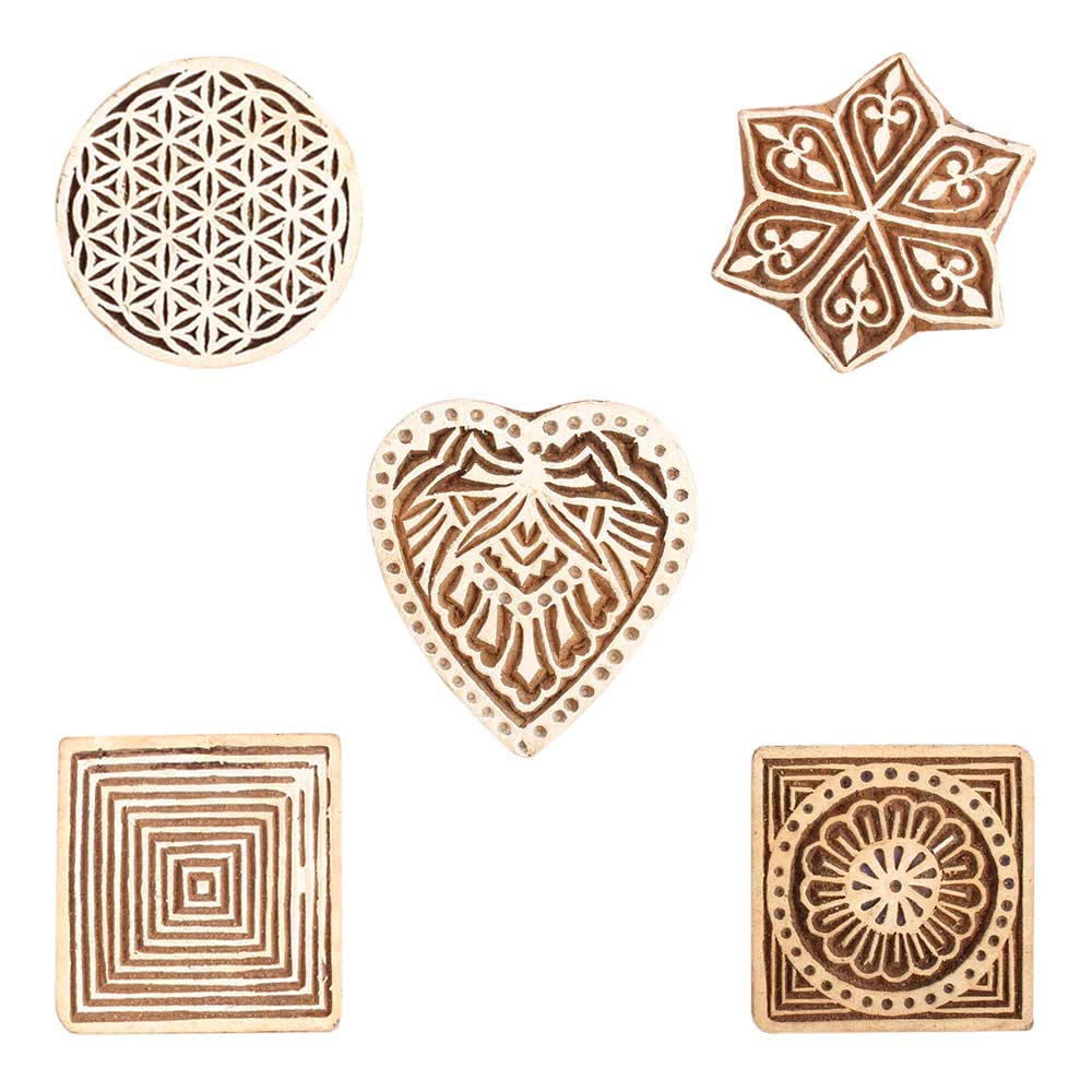 Set of 5 Piece New Mix Wooden Printing Block. Ideal for use on Fabric, Paper, Canvas, etc. These Blocks can be use to Print with Oil Colors, Fabric Colors, Water Colors, Acrylic Colors and Vegetable Colors.
