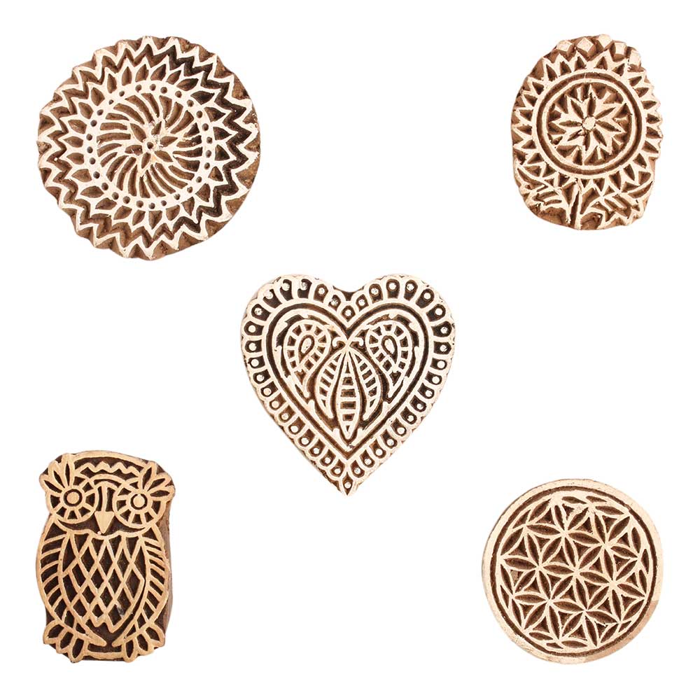 Set of 5 Piece New Mix Wooden Printing Block. Ideal for use on Fabric, Paper, Canvas, etc. These Blocks can be use to Print with Oil Colors, Fabric Colors, Water Colors, Acrylic Colors and Vegetable Colors.