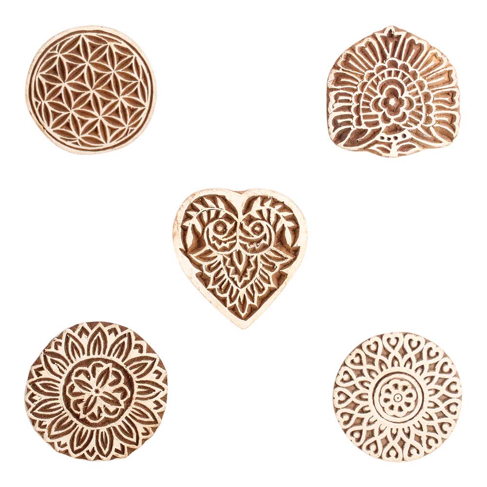 Set of 5 Piece New Mix Wooden Printing Block. Ideal for use on Fabric, Paper, Canvas, etc. These Blocks can be use to Print with Oil Colors, Fabric Colors, Water Colors, Acrylic Colors and Vegetable Colors.