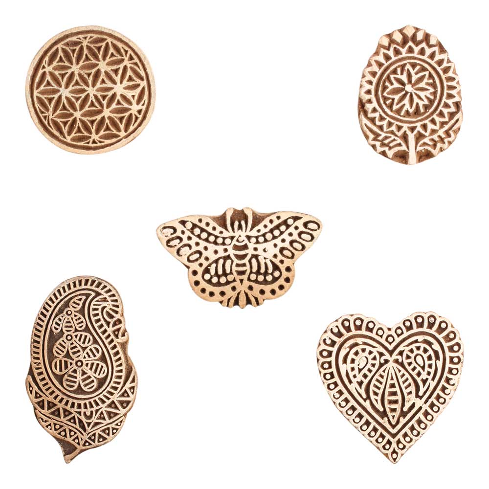 Set of 5 Piece New Mix Wooden Printing Block. Ideal for use on Fabric, Paper, Canvas, etc. These Blocks can be use to Print with Oil Colors, Fabric Colors, Water Colors, Acrylic Colors and Vegetable Colors.