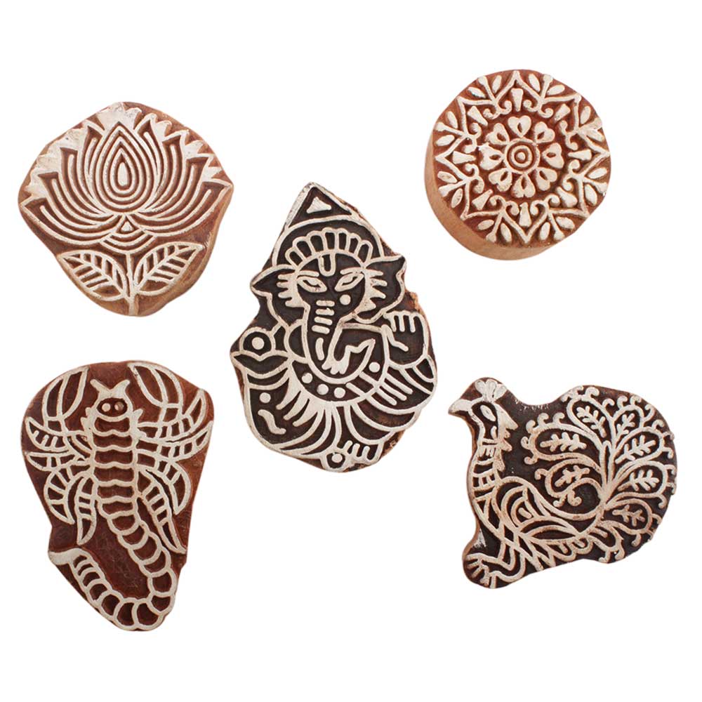 Set of 5 Piece New Mix Wooden Printing Blocks. Ideal for use on Fabric, Paper, Canvas, etc. These Blocks can be use to Print with Oil Colors, Fabric Colors, Water Colors, Acrylic Colors and Vegetable Colors.